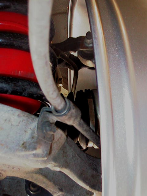 These wheels stick out a little too far. The pictures were taken with the stock springs. Clearance on the inside is good, however, but close on the sway bar. Limiters will have to be used if 36mm offset wheels are used instead of the 24mm shown. I stayed with the 24mm wheels after lowering the car.